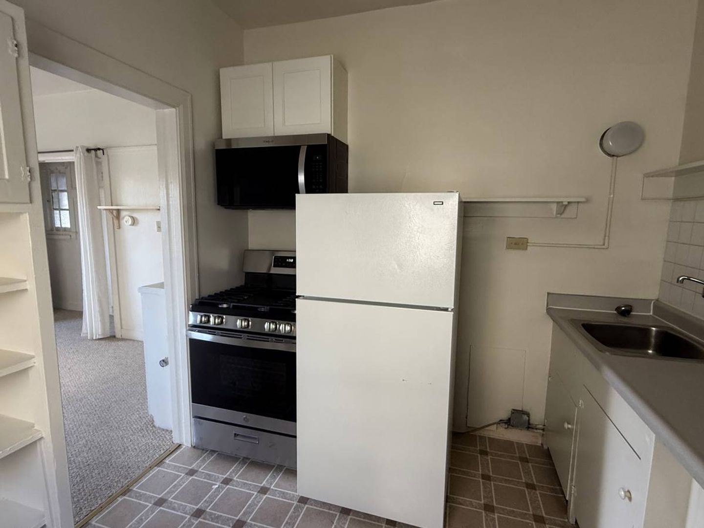 * Newer gas range and over-range microwave.