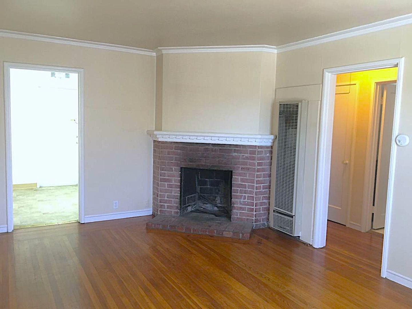 * The fireplace is located in the living room area.